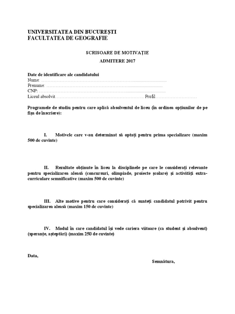 Admitere Licenta Formular Tip Scrisoare Motivatie Geografie