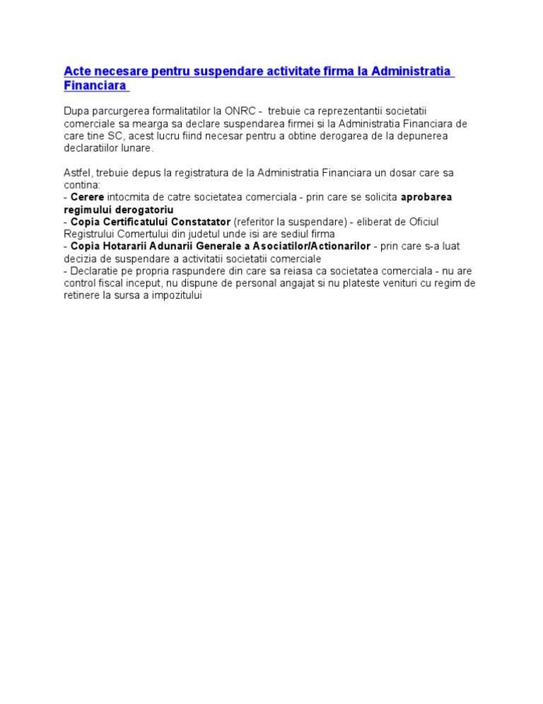 Acte Necesare Pentru Suspendare Activitate Firma La Administratia Financiara