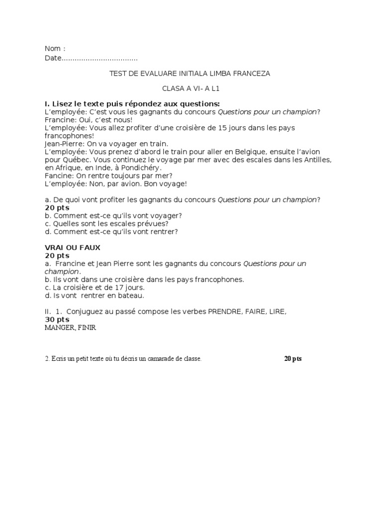 Teste Evaluare Naţională Limbă Si Comunicare Limba Franceză Teste Pisa Clasa 6 Varianta 3